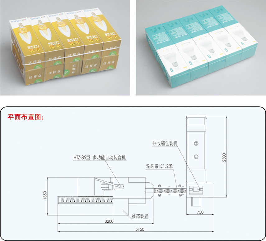 本生產連動線是采用輸送帶連機模塊式組合,集光、電、機、氣一體化來完成物料裝盒、熱收縮包裝;是根據PLC電腦及集成控制系統來同步進行,形成自動生產線。