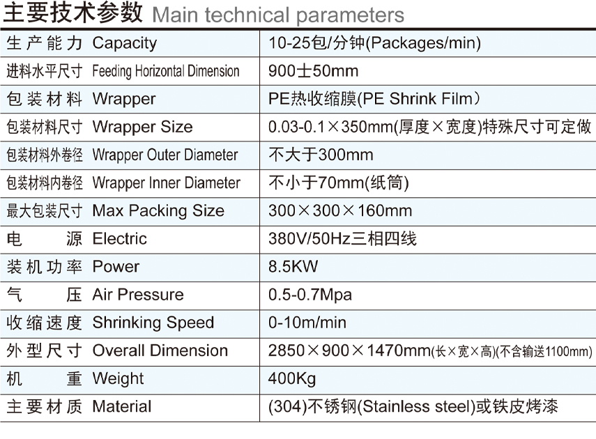 The product is suitable for assembly packaging of cartons coming out of the cartoning machine. It adopts PE film to carry out cuff type heat shrink packaging. Packing modes include: single-row packaging, front and rear row packaging, and upper and lower row packaging. During feeding and packaging, the functions such as automatic completing of the object piling mode and its conveying to the designated position, automatic conveying of packaging film, automatic film cutting, and shrinking can be automatically completed. The equipment adopts human-machine PLC control, photoelectric tracking and variable frequency speed control. The malfunction cause of any abnormal situation that occurs during the operation will be automatically displayed, so as to eliminate the malfunction timely. The machine can be used singly or work with the cartoning machine to form an automatic production line.